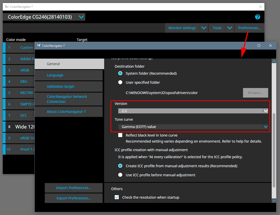 If that's not it, set ColorNavigator to make version 2, matrix-based profiles. The defaults are version 4 and LUT (table) based. In ColorNavigator, a matrix profile is known as "gamma (EOTF*) value". Photoshop will handle both v4 and LUT profiles without problems, but some other applications are known to not treat those profiles correctly.