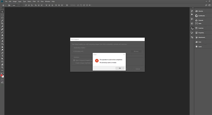 when i go to Import>WIA Support The usual dialogue box pops up asking about Destination Folder. The Destination folder I used last is not valid or connected anymore. If I click on BROWSE to select a different folder I get an error box saying the directory name is invalid. Of note, when the dialogue comes up it looks like the Browse button is already depressed?