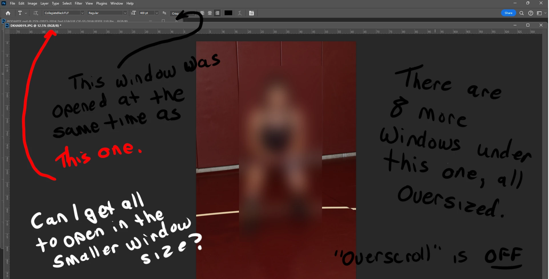 I don't use tabs. My workflow requires separate windows for each image. When I open images, the window will resize to the image for the first 3. If I open more, the window will fill the screen while the image remains the same size. I need to be able to see the tabs cascade so I can find my frame numbers without scrolling through a dropdown menu. In CS6, it was automatic. I have unchecked 'overscroll'. I've attached an image in case I'm not using the correct terminology to explain my problem. There's probalby something obvious that I'm missing. This issue also hides my tool bar until I drag the windows to snap them to the edge of their images to unbury it. My workflow has been negatively impacted by this issue. Thank you for any suggestions.