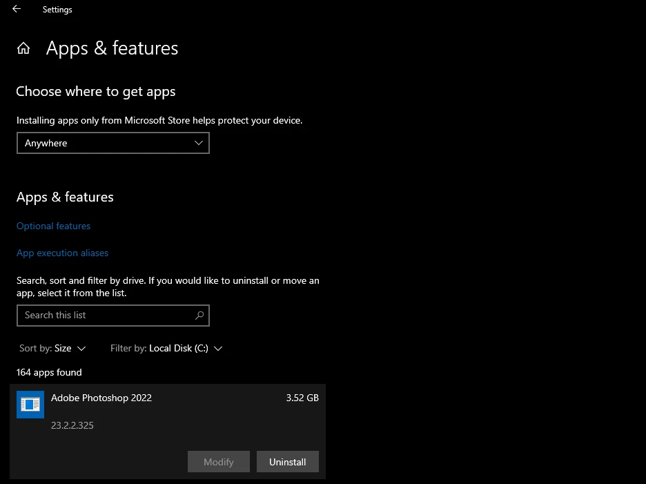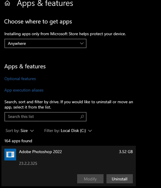As shown in this picture, Windows settings says Photoshop 2022 (23.2.2.325)