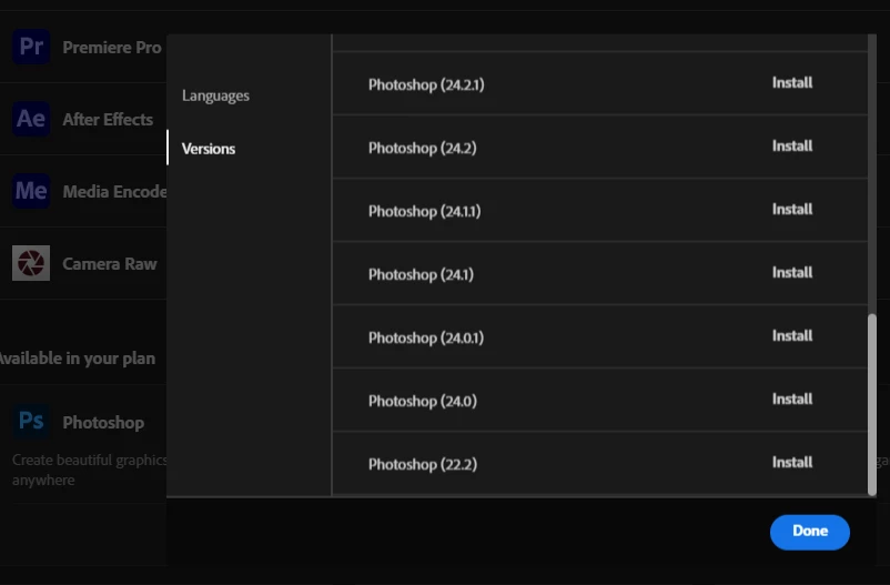 Although, there does not seem to be an option to install the exact same version or even any Photoshop 2022 version in CC.