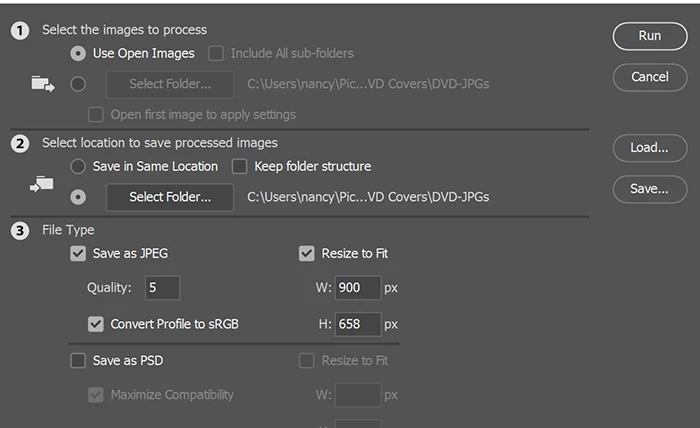I have learned to open one of the photographs in the folder, create/record the action --   Resize, save and then stop the recording to save the action.