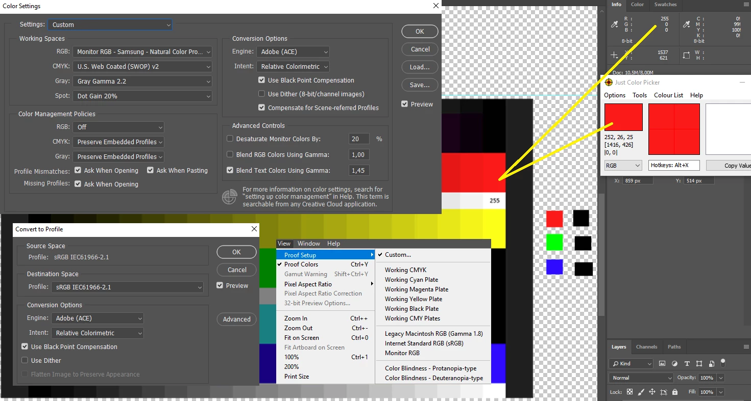 Photoshop displays slightly wrong colors to me. For example I see this color in internal Photoshop picker in the project: 254;0;0. After PrtSc and paste it becomes 252;26;25 on the screenshot. 0;254;0 turns to 0;255;2. (0;0;254) to (48;10;254). (1;0;0), (0;1;0), (0;0;1) to (1;1;1). I have no issues in exported files, this problem is only on the display inside the Photoshop. Does anybody know what is wrong? Third-party color pickers like jcpicker shows the same issue in the Photoshop window.