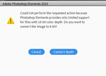 Hi, I have resently updated to Elements 2025. Now when I'm editing it comes up with a message below. This has not been an issue in previous versions. If I click Convert I'm able to continue but if I don't. I there something I need to change?