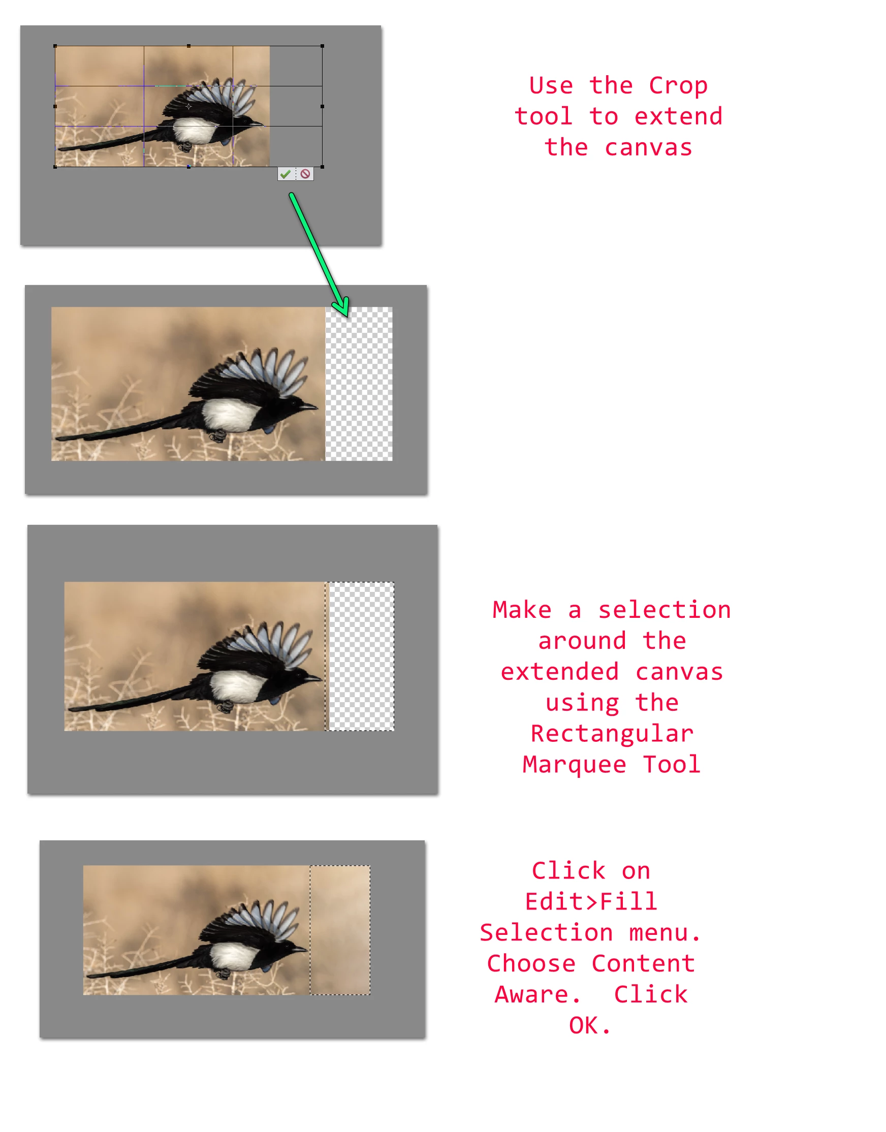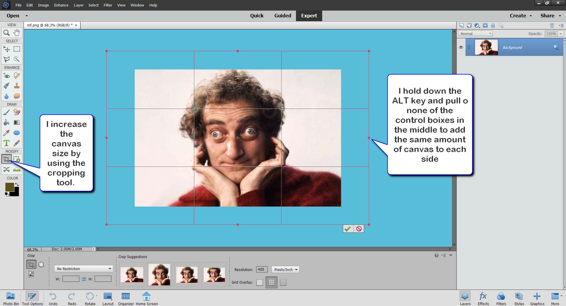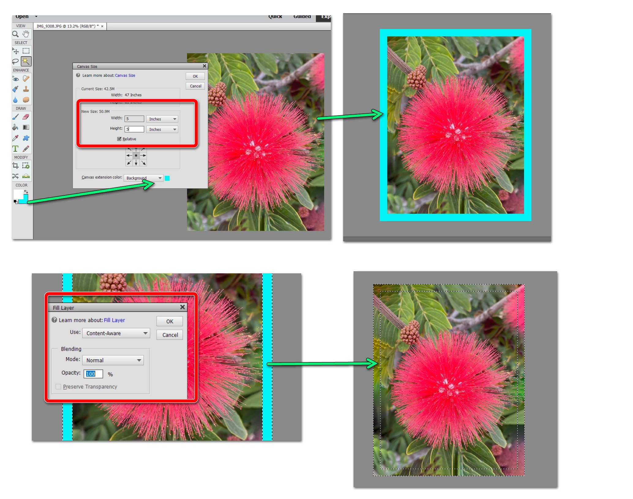 Can Photoshop Elements 2021 add canvas by extending background? I have selected Canvas Size, made the appropriate adjustments including selecting background as the canvas extension color but when I click Edit the Fill Selection choice is not active. What am I doing wrong?