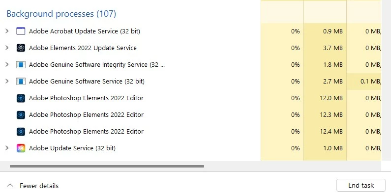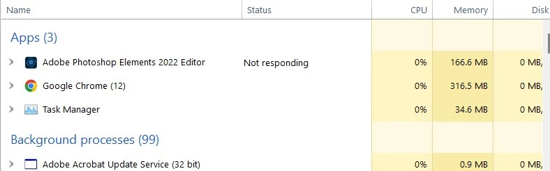 Recently installed Adobe Elements 2022 on a new windows 11 PC Computer. I can normally open the Editor and the Organizer one or two times. If I try to open either one again, the program appears to try to open, but nothing happens. If I look in the Task Manager, at times either or both Elements and Organizer is still shown still in the Apps section with "not responding" shown next to them. I have to highlight and "end task" to shut it down. After doing this, the program will open again one or two times then repeat the process. Other times, the program will attempt to open, but nothing happens. I look in Task Manager and the program is shown running in the backgraound processes area. Each time I attempt to open one of the programs (elements or organizer), a new process is started, but the program will not open. I must use the task manager to end each task, or restart the computer to clear the processes.