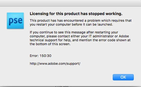 I've been using photoshop Elements V8 on my Mac with the El Capitain OS. Even though it is an old version, no longer supported, it still worked perfectly. I updated my operating system to Sierra 10.12.6 and the program wouldn't open. I got error message: 150:30. (see below) Note: I did try restarting as the message suggested.
