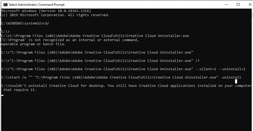 NOTE: When i try to uninstall Adobe creative cloud using silent switch i got error prompt stating "Couldn't uninstall creative cloud for desktop. you still have creative cloud applications installed on your computer that require it".