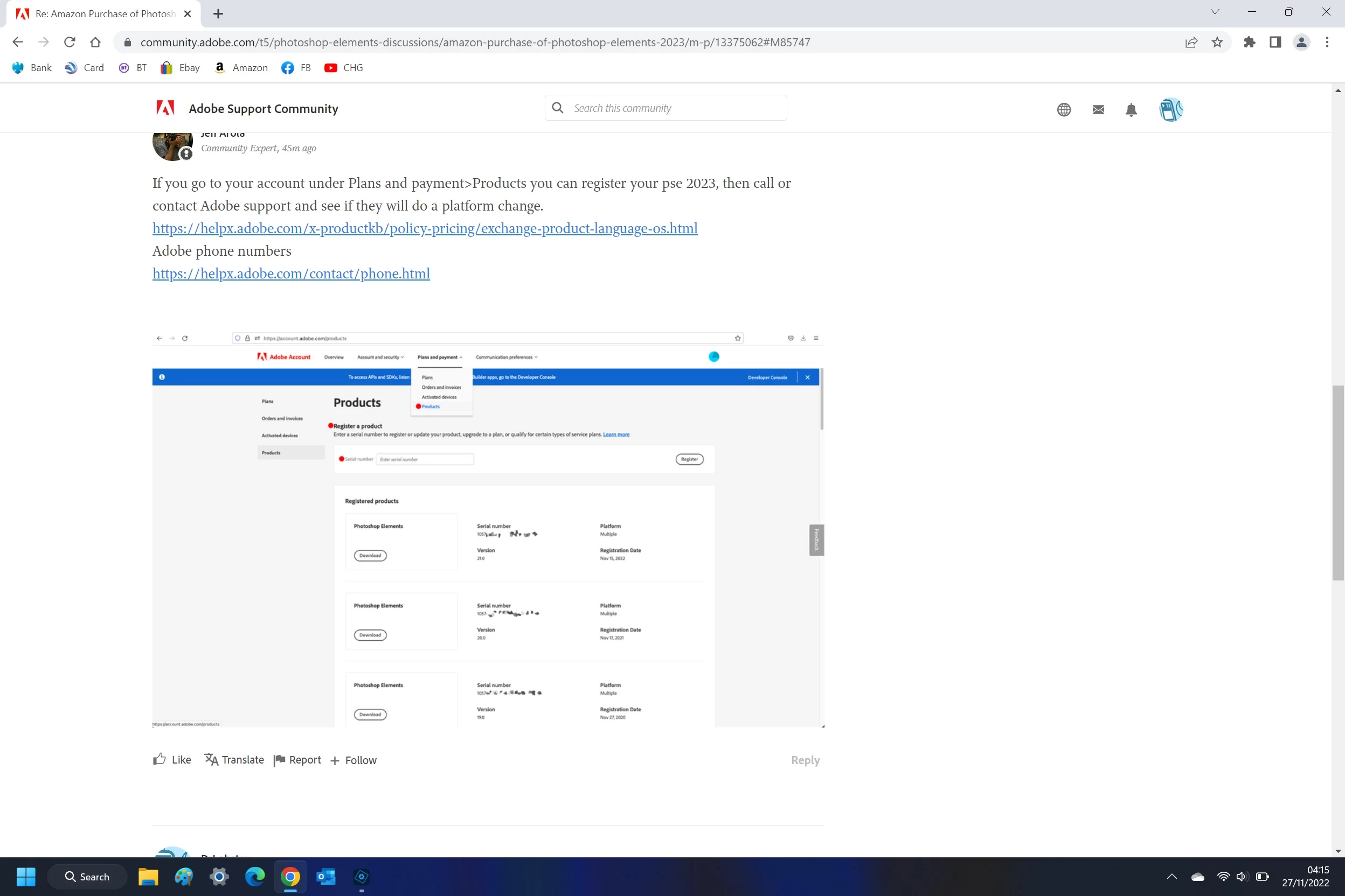 Purchased Adobe Photoshop Elements 2023 from Amazon UK. I selected the PC version but I'm sure now I ended up with the MAC version. I can't return this on Amazon and it's the software isn't listed on my Adobe Account page. It gets worse, I can't see the previous versions of photoshop that I've bought and registered over the years, this include Photoshop Elements 13, 14 and 2020. I have done everthing to try and sort this but Amazon have no return facility for software and Adobe requires that you register your software in the downloading process. I am frozen out of any channels to communicate with either Amazon or Adobe. Can anybody help? (or has my money gone down the drain and there's no way back??)