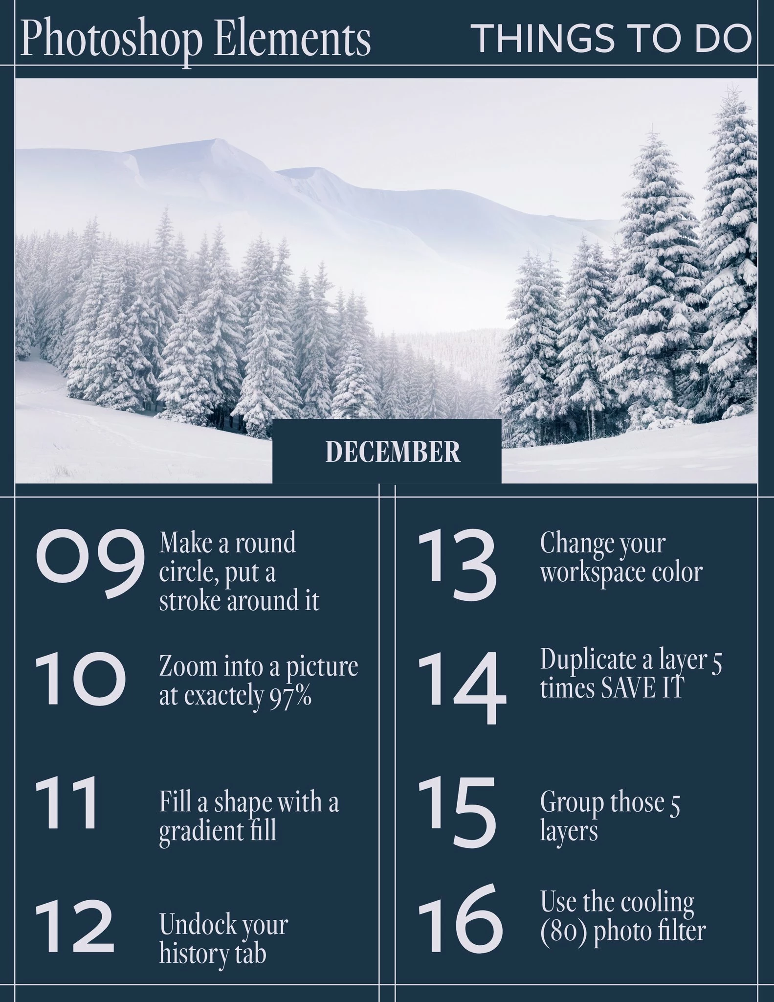 In a Facebook group I posted this image-- each day is a very basic thing to do/ practice, none of the daily tasks are terribly difficult, but they do make you explore the program a bit.