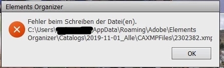 The error message means something like: "error writing to c:\users\...\...\catalogname\CAXMPFiles\2302382.xmp"