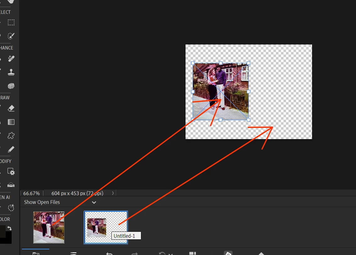 In the following screenshot, I have created a new blank file and dragged the photo up to it and resized it.