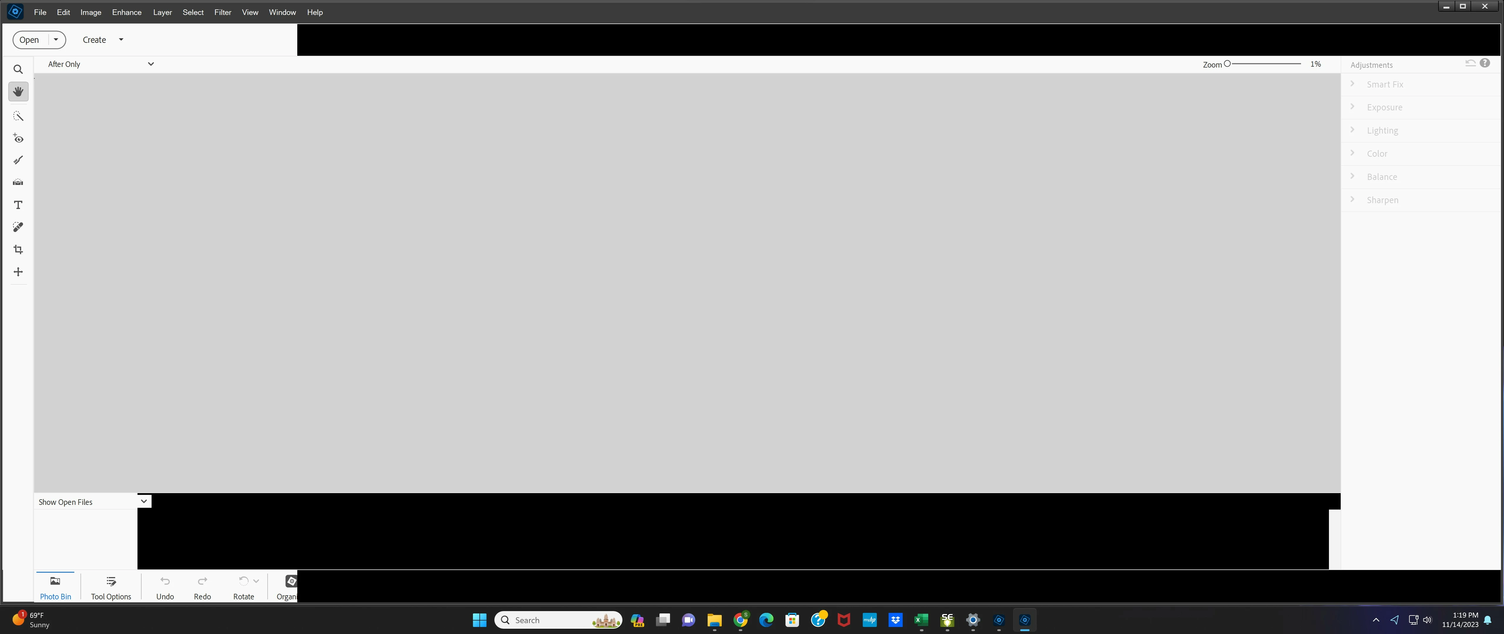 I recently installed PSE 24 and the bottom toolbar has a white portion (which shows fine) and a much larger black portion that extends across the remainder of the screen. I cannot see any tools or photos loaded in this black portion, but if I hover my mouse, it shows things are there and I can click on them (I just can't see it). I have tried rebooting and even reinstalling with no luck in order to get this black bar removed. Any ideas?