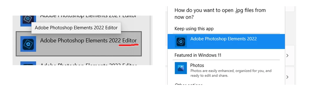 @BanJaker, the devil is in the details. Your screenshot shows that you have chosen Adobe Photoshop Elements 2022 as the default program. This is the Home Screen program. You need to choose the Adobe Photoshop Elements 2022 Editor as the default program.