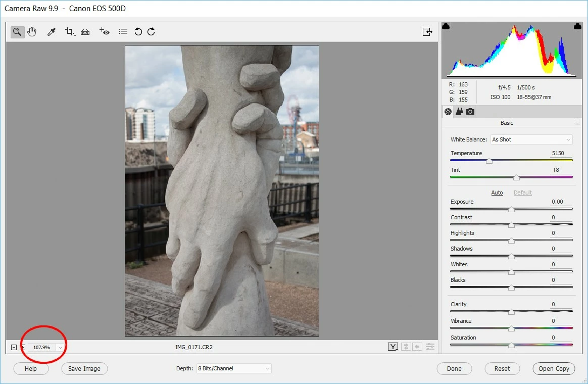 However when I open RAW files (and they are definitely CR2 RAW files with a file-size each of approx 19MB) they fill the screen, but the size shows as 107%, whereas I would expect something more like 25%. I have tried full-screen and there's no difference. I have also done a full install and reinstall of the program and again, no difference .
