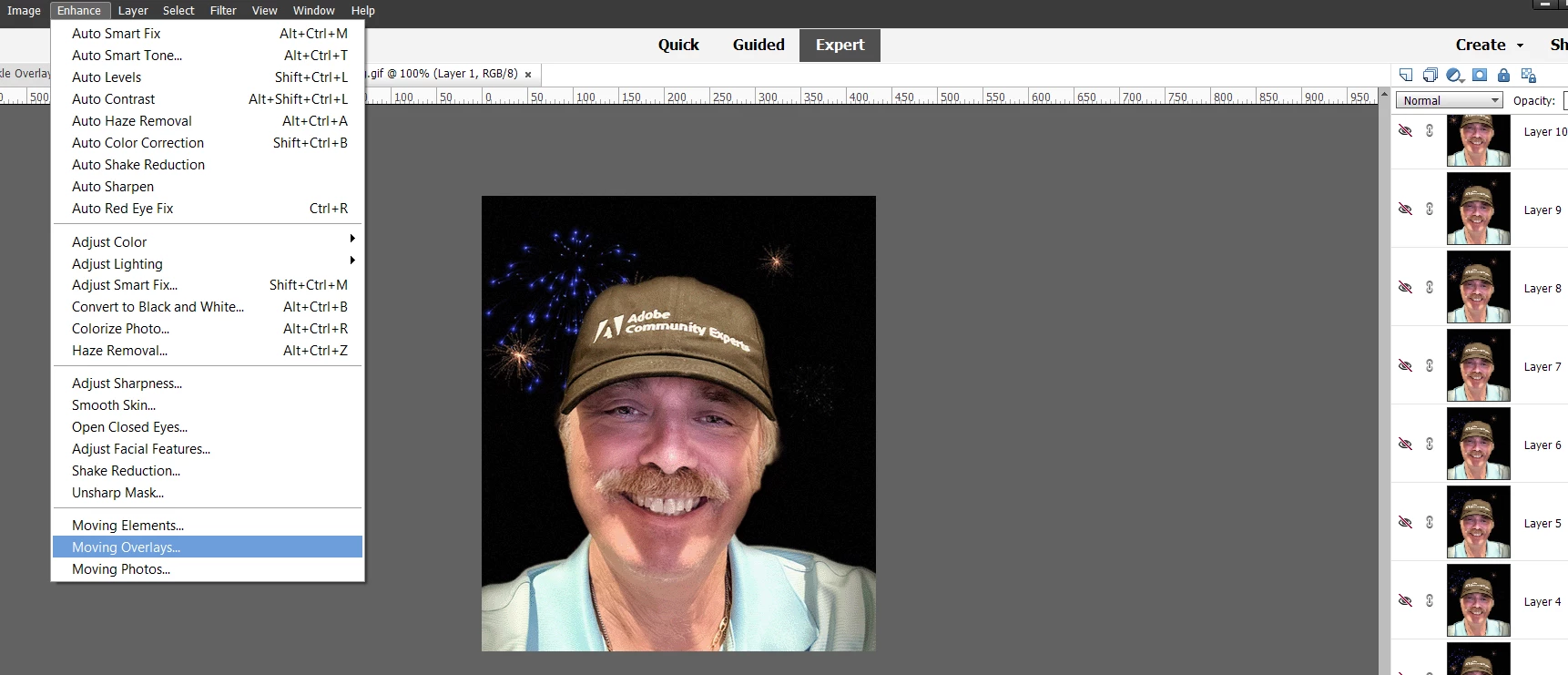 However, Elements 2023 has a number of new features that create animated gifs automatically.  So, for example, the avatar I use for this website was made with the Enhance>Moving Overlays feature.
