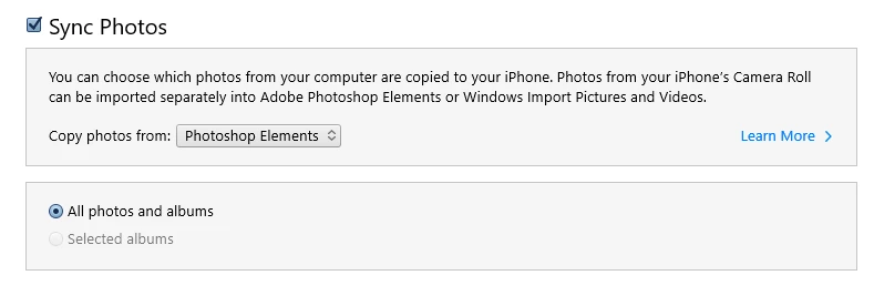 I have installed PE2020 and I am unable to download photos from my PC to my iPhone or iPad using itunes. The option is present in itunes but no photos appea or albums appear. iTunes screenprint below. I used to do this years ago on an older version of PE.