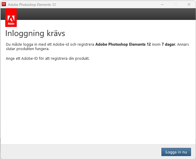 When I start Elements 12 I'm requested to log in and registrate my Adobe Photoshop Elements 12 within 7 days otherwise the product will stop working. This will not help. I have bought(cash) and used Elements for at least 11 years on my old PC. I have now installed Elements on my new PC, but I can’t start my Elements.