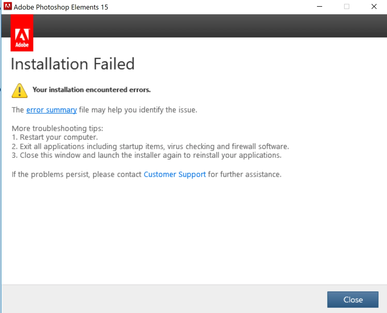 Cannot install Photoshop Elements 15