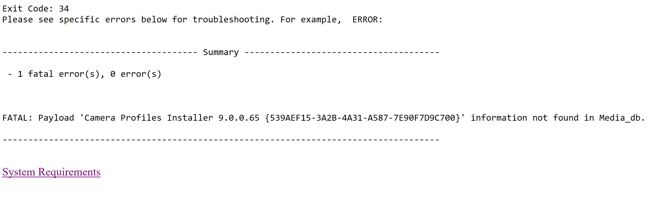 Below are the error messages I keep getting. I follow all the steps but nothing has helped. There seems to be no help for exit code 34. When I try to contact Adobe, I get stuck in a loop that keeps directing me to forums.