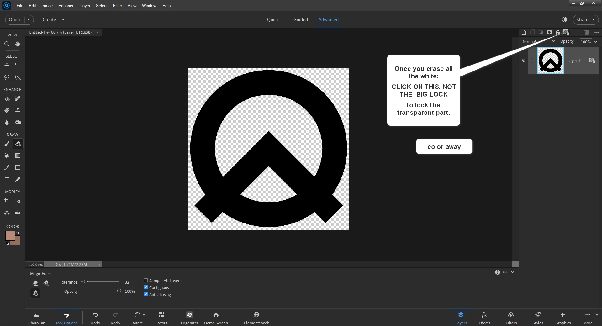 How do I amend a line drawing logo to have a completely TRANSPARENT BACKGROUND . . . and then enable me colour the remaining line drawing with any colour from the colour palette?