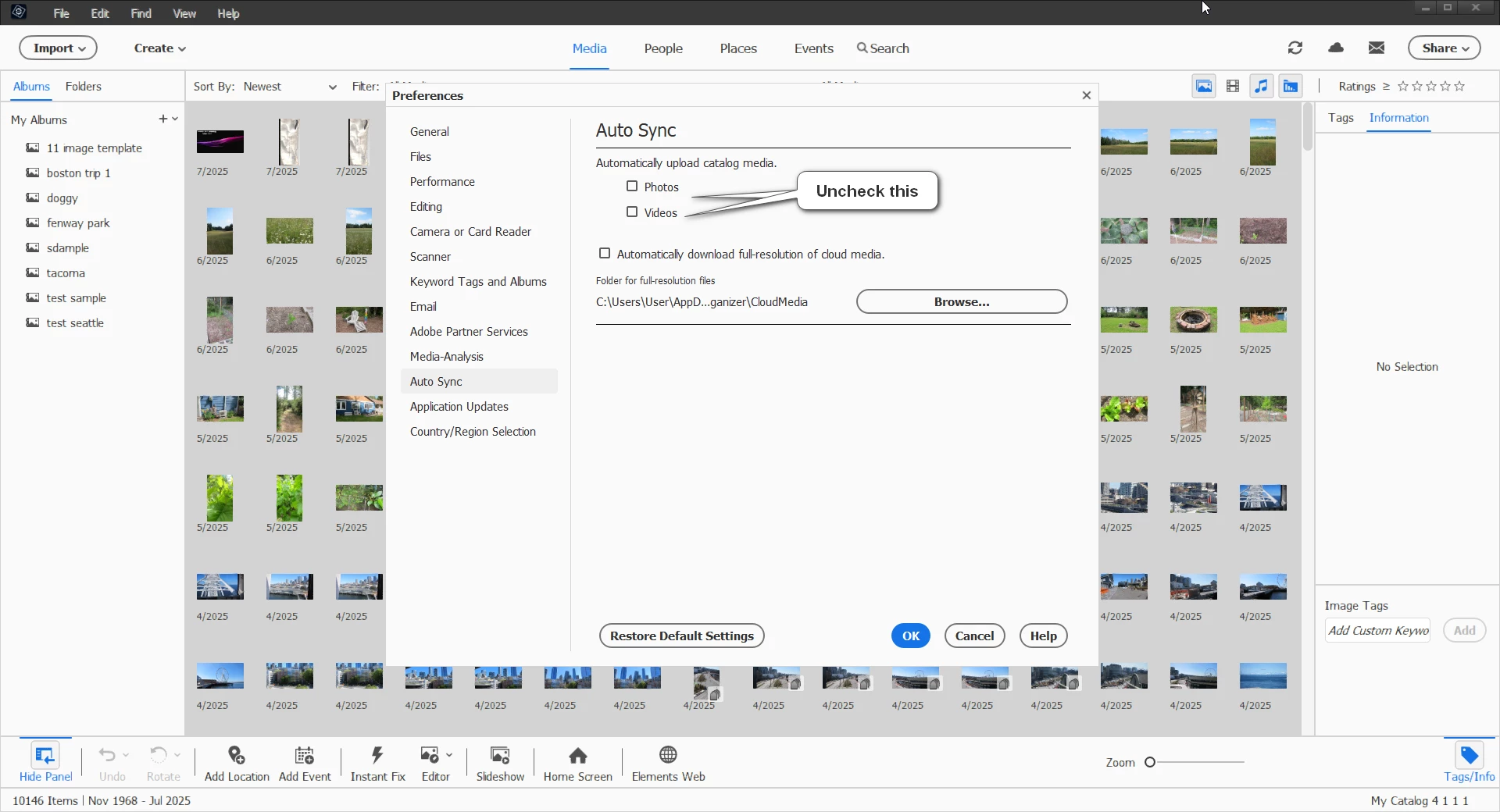 I have used Adobe Photoshop Elements for many years. All of a sudden the software is putting my photos on the cloud. I do not want my photos on the cloud. How do I turn this off?