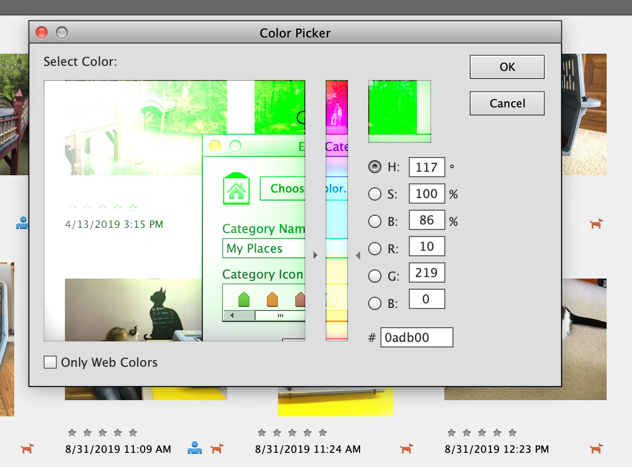 I am trying to change the color associated with a category tag in the Organizer. I have Elements 2021 on a mac running Monterey 12.3.1. In the Keywords I select my category tag, then choose "Edit" from the drop down menu next to Keywords. This brings up the "Edit Category" box, then I select "Choose Color". The Color Picker box comes up but is distorted. I will try to attach a picture below. The 3 windows within the box that are supposed to display colors are instead semi-transparent. I can see through these windows to the Organizer thumbnails below. The windows are not totally clear - they appear to have faint colors over them, as if looking through pale stained glass. Any idea how to fix this? The Color Picker box displays normally in the Editor.