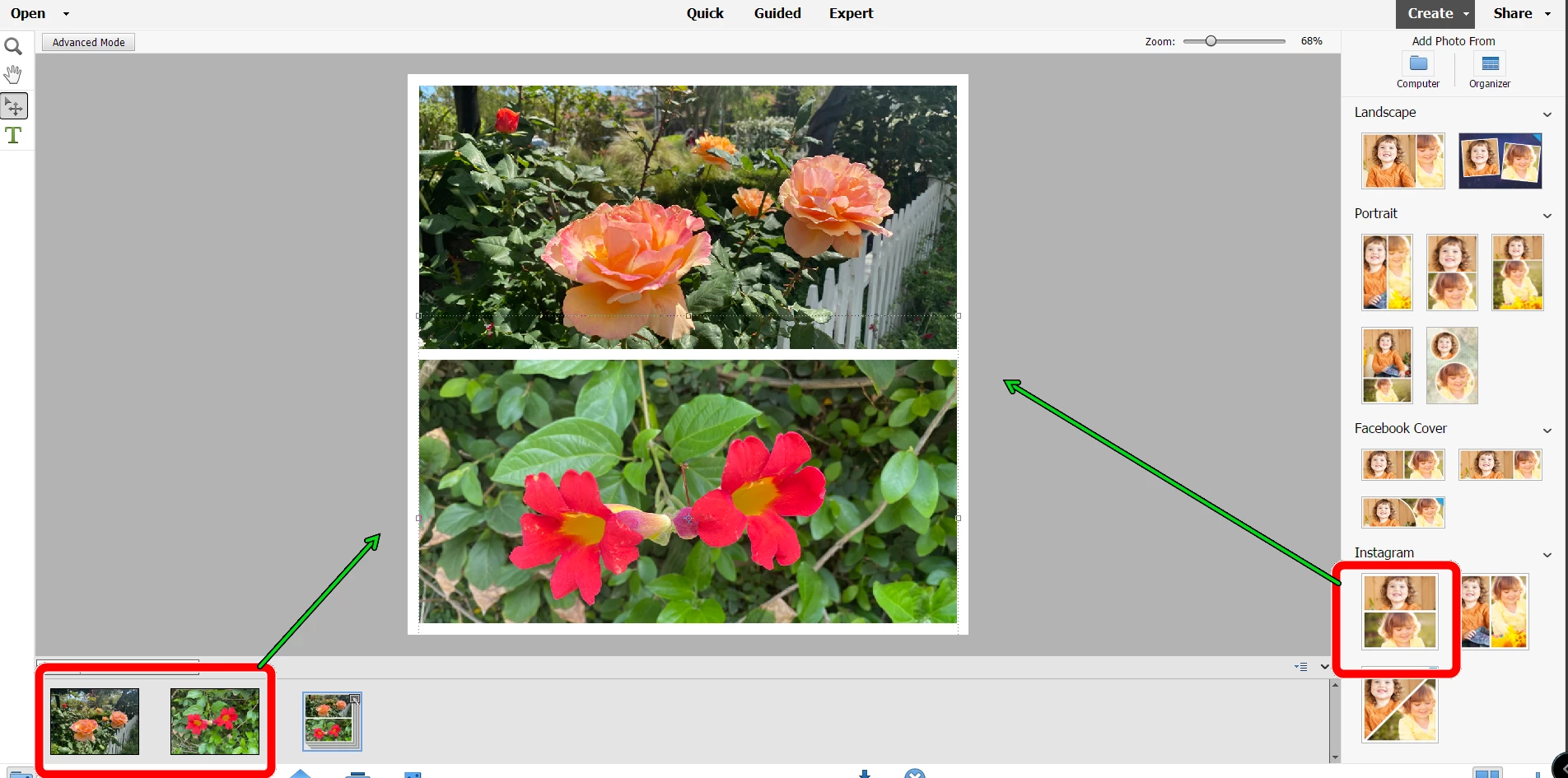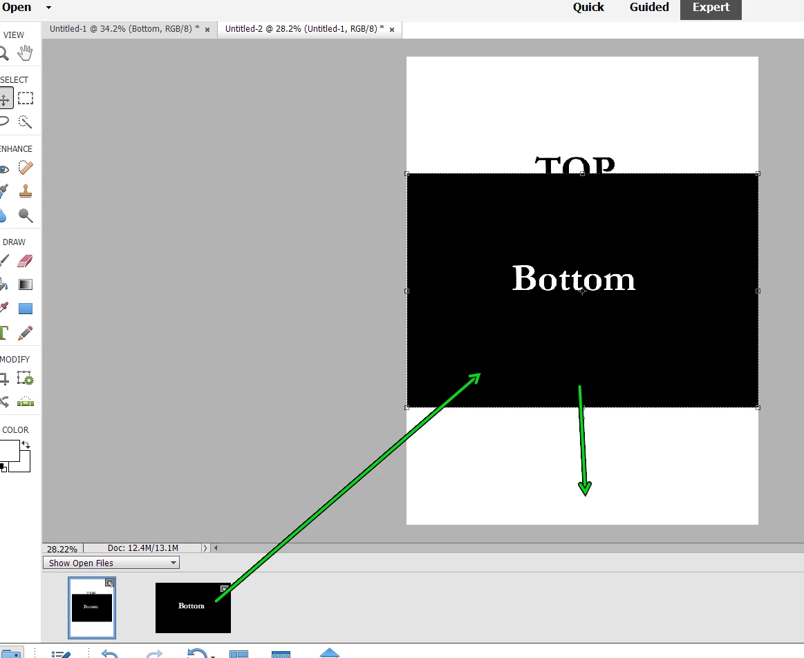 In Photoshop Elements 2022, I would like to combine two photos vertically into one photo. Some how I accidently did it for another set, but can't seem to replicate the process again. The originals were so large I had to save into two separate files. I've looked at the various dicussions and the Quick, Guided and Expert modes with no luck. Any assistance would be greatly appreciated.