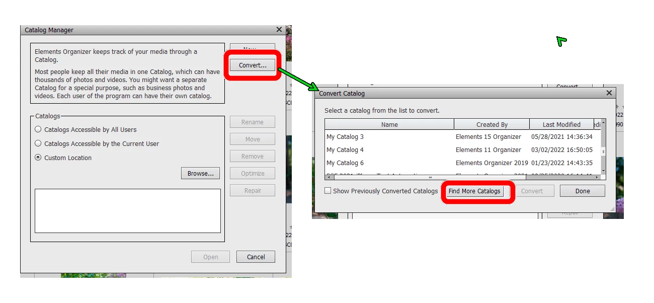 Your important advice to tick the checkboxes to show already converted catalogs and if needed to search in more locations will bring you in 'custom location' if needed before you start the conversion.