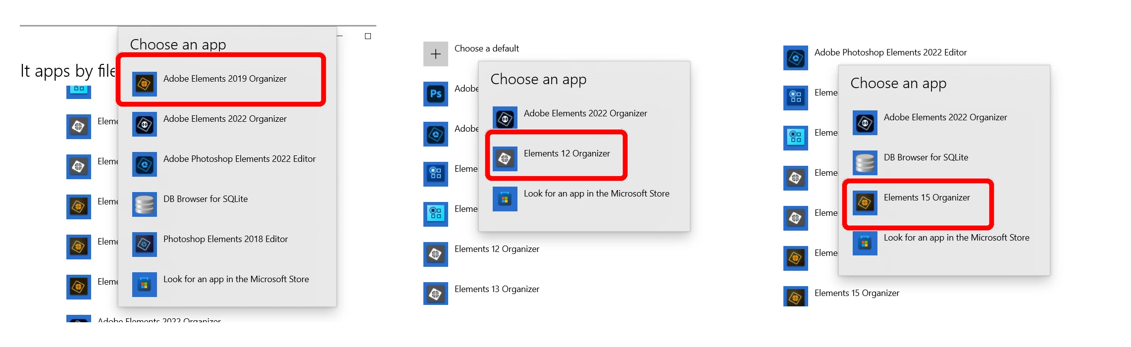 Michel, I also conducted some tests with Windows Settings for file associations. I got different options for each version of Elements on my computer (10 to 2022). Here are some samples: