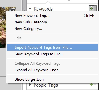 In Elements 2022, click on the same Tags panel dropdown arrow and select Import Keyword Tags from File:
