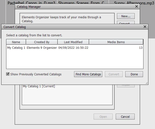 PSE 2022 found the catalog and I was able to convert it. However, when I opened the catalog all it showed was .mp3 files. I navigated using the tree view of the file structure and foolishly imported all my images (MichelBParis - you advised against doing so; I thought PSE would give me an option to stop before the importing began - very poor choice on my part).
