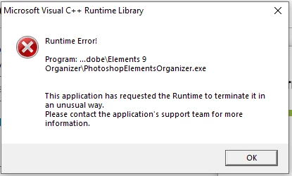 I had less luck installing the latest Visual C++ Redistributable. PSE9 throws the same error as in my previous response. A screen shot with the version I installed is included.