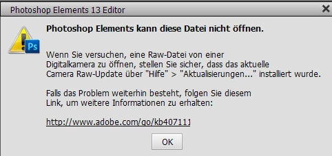 I've Photoshop Elements 13. When I want to open an RAW-Format (CR2), I got a defect report.