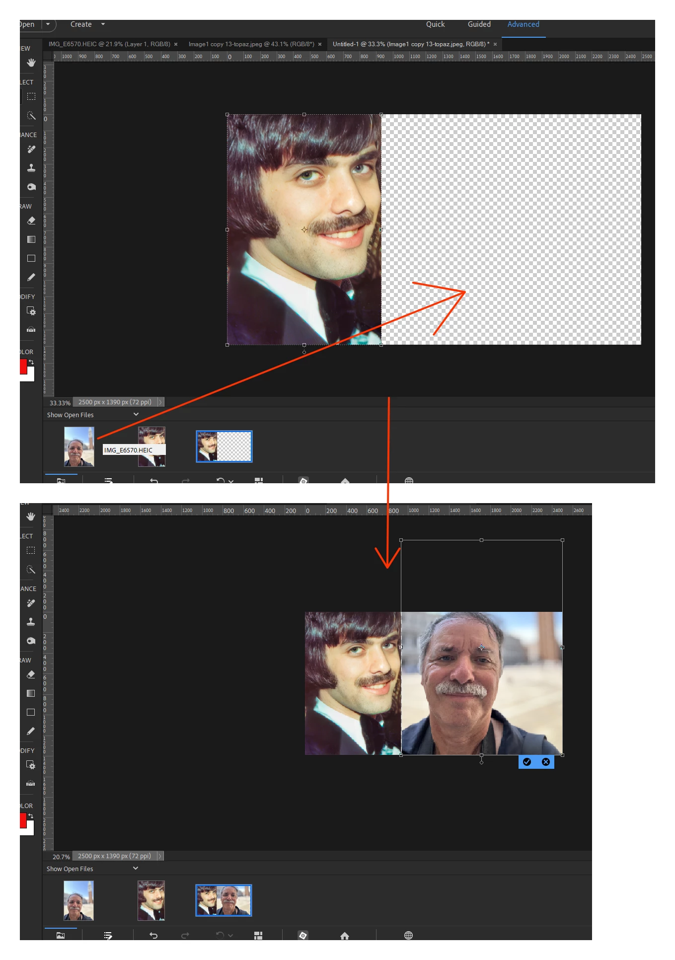 Creating 1 image from 2 side by side photos showing the comparison of the two