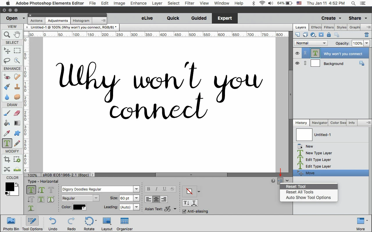 I'm not able to figure out why all of my cursive fonts are showing up disconnected in PSE15. They work in every other program on my computer just fine. I'm trying to make myself a new logo in PSE and want to use cursive for the name, however it looks really stupid all disconnected. Is there any easy fix I'm completely missing?