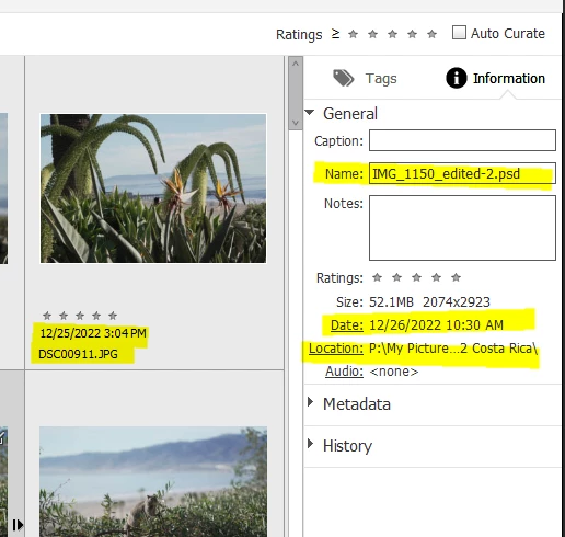 Is it possible to download data from Photoshop Elements Organizer? Specifically, want to download file name, file date & file location.