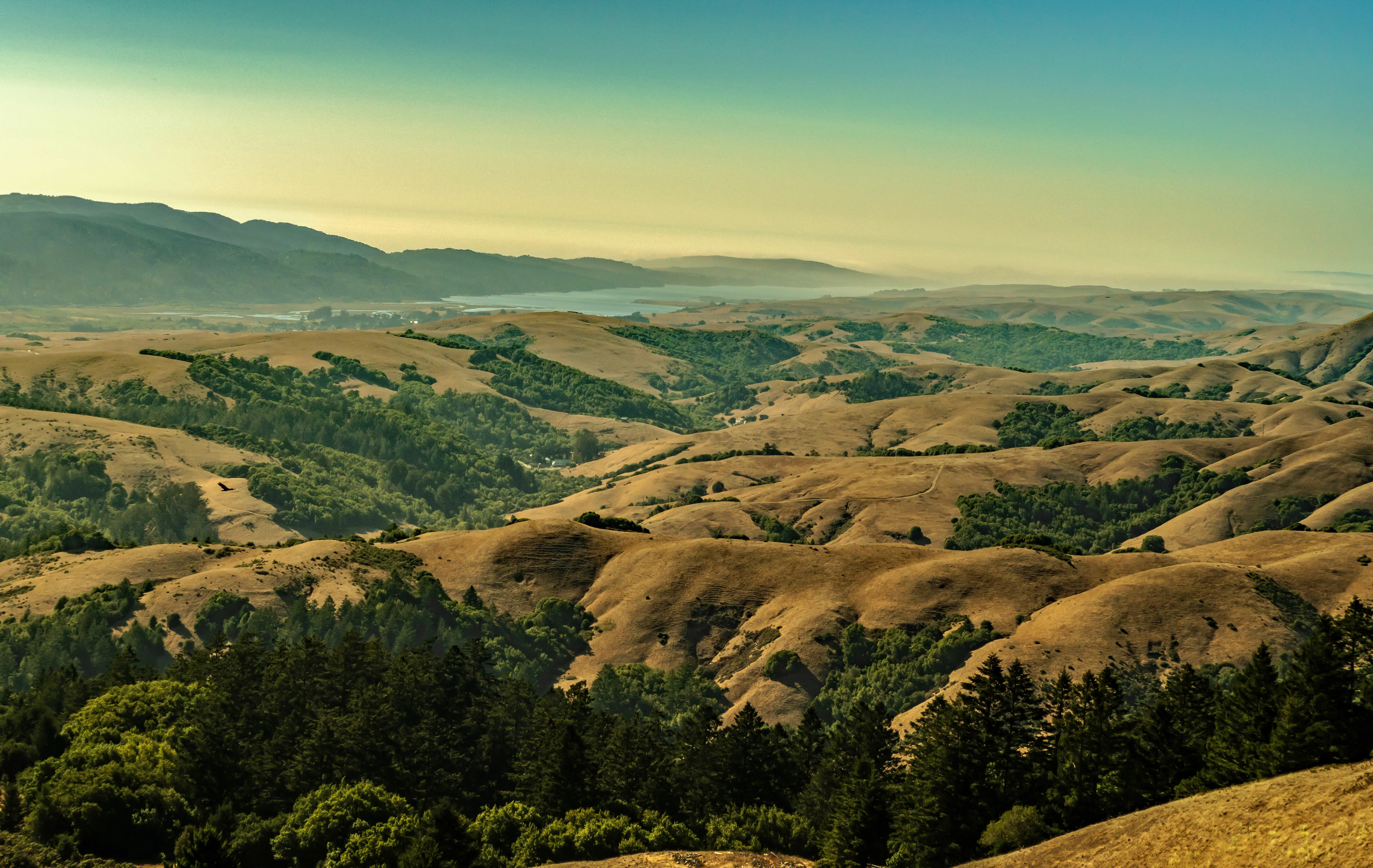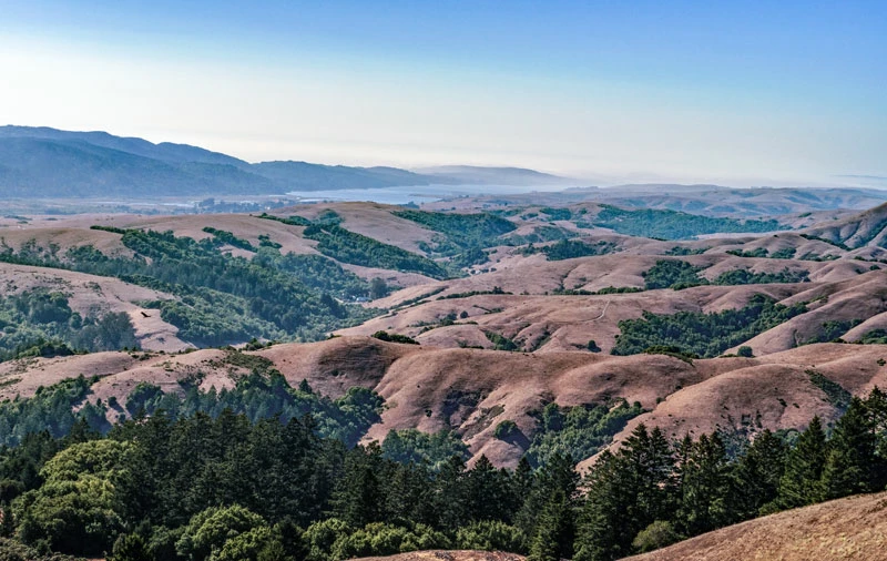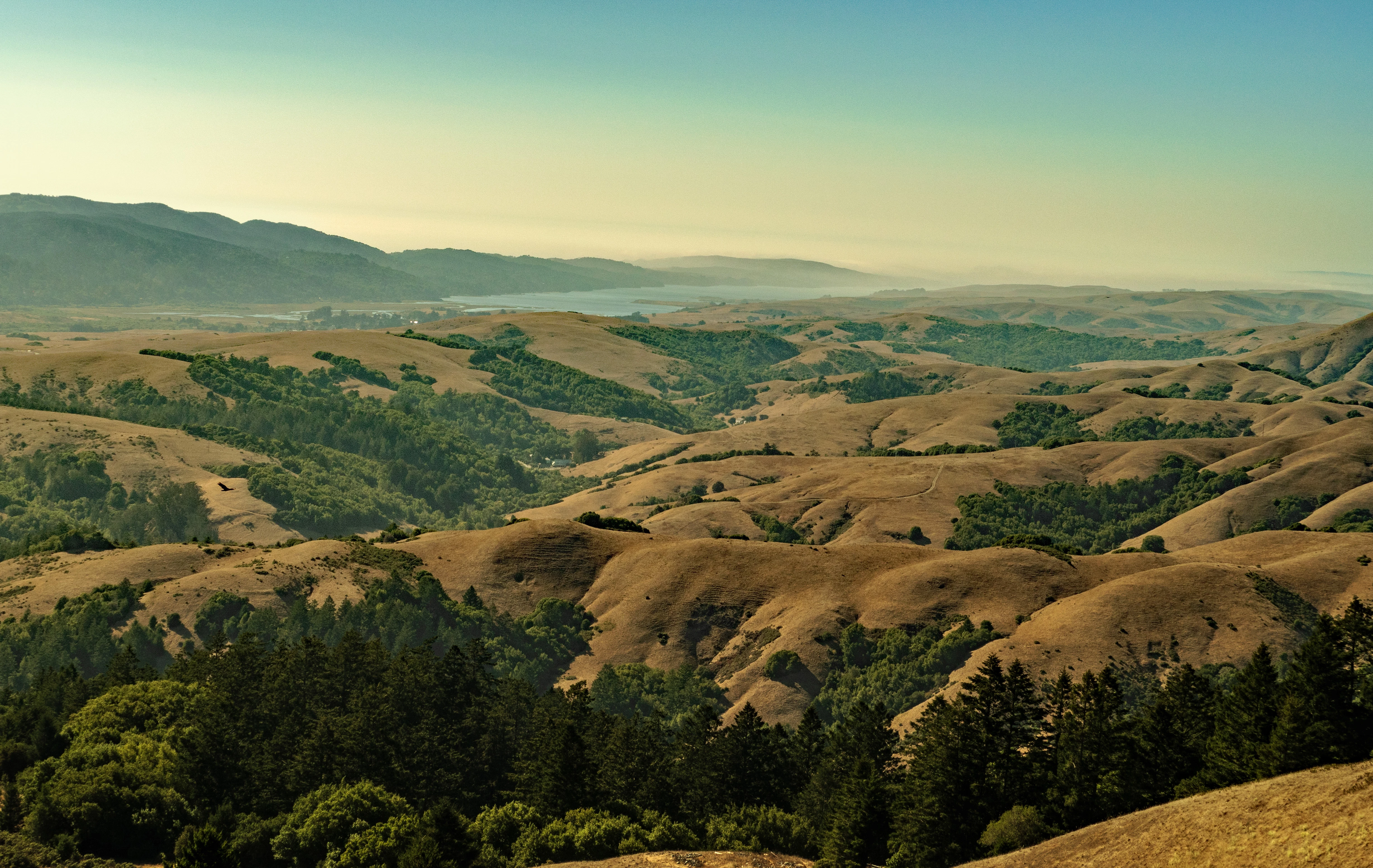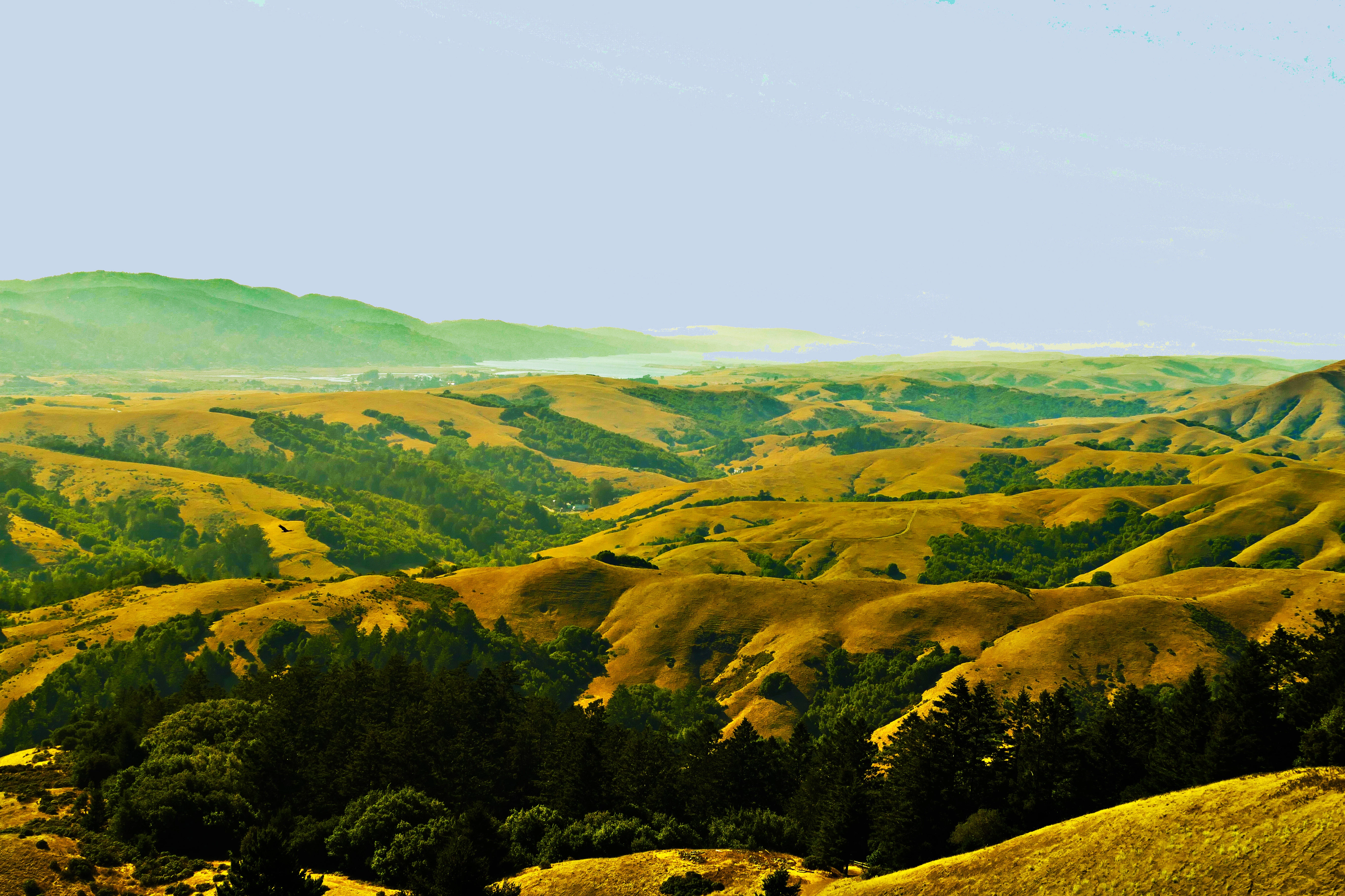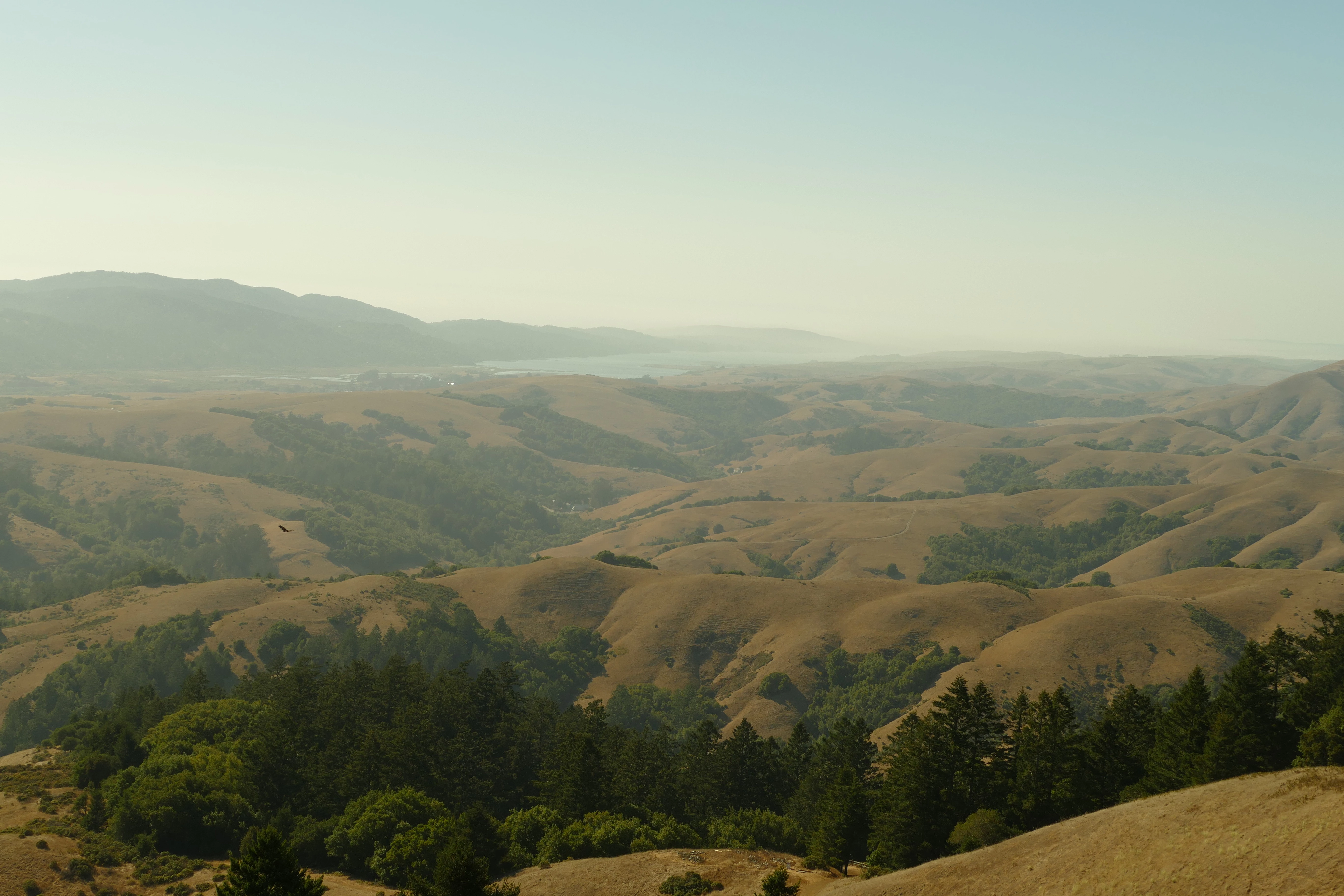 I shot the following, looking northwest from atop Mount Barnabe in Samuel P.Taylor State Park, at about 5 p.m., with the sun having begun its descent in the west: