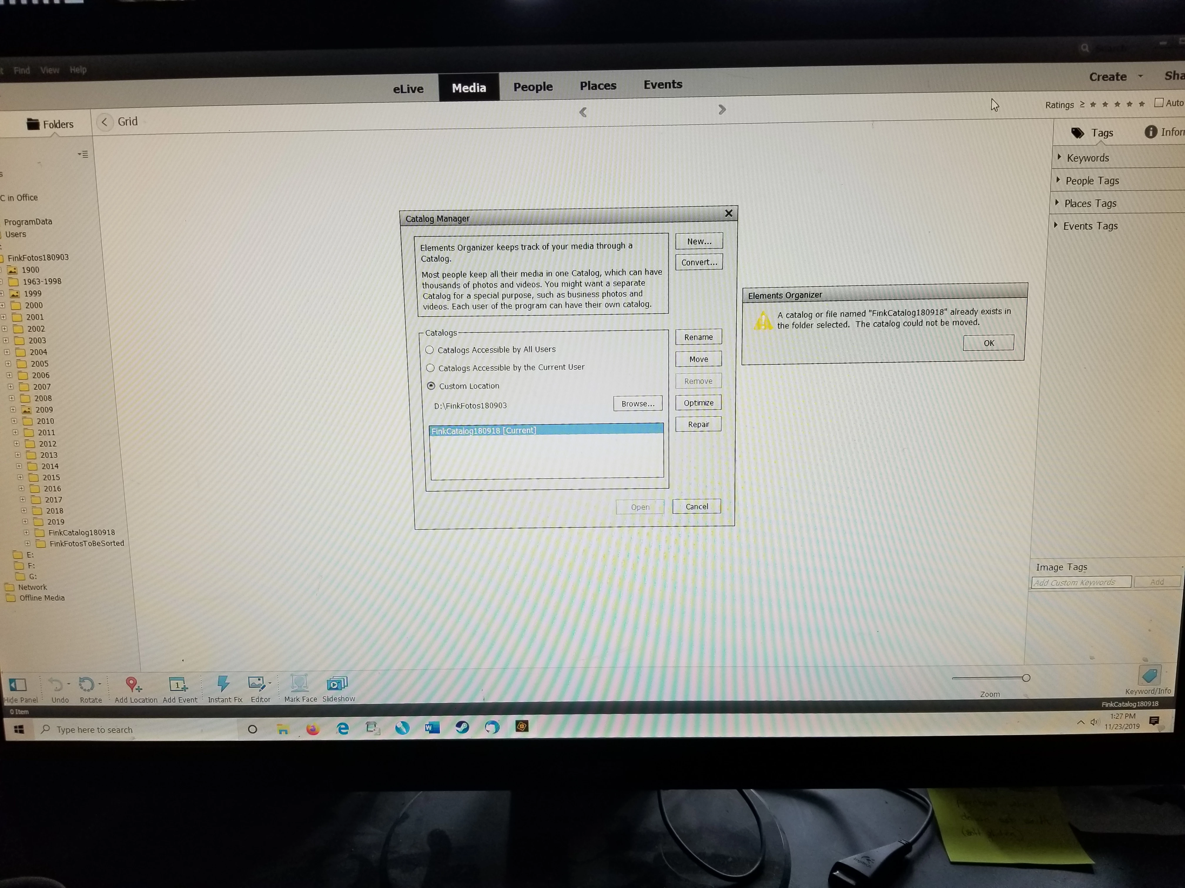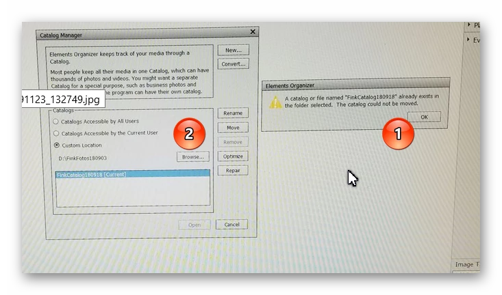 Currently, I have both catalogs and the program opens normally, showing the old catalog name in the bottom right corner of the main media screen. When I go to File/Manage Catalogs, the window shows the old catalog name in window below Custom Location: OLDCATALOG [Current]. If I select Browse to the right of Custom Location, I can find the new catalog in the same external harddrive, and when selected the file path correctly shows the new catlog under Custom Location. However, nothing else happens. The buttons (Rename, Move, Remove, Optimize, Repair and Open) remain unlit and cannot be selected. I essentially have no option except to Cancel. Suggestions?