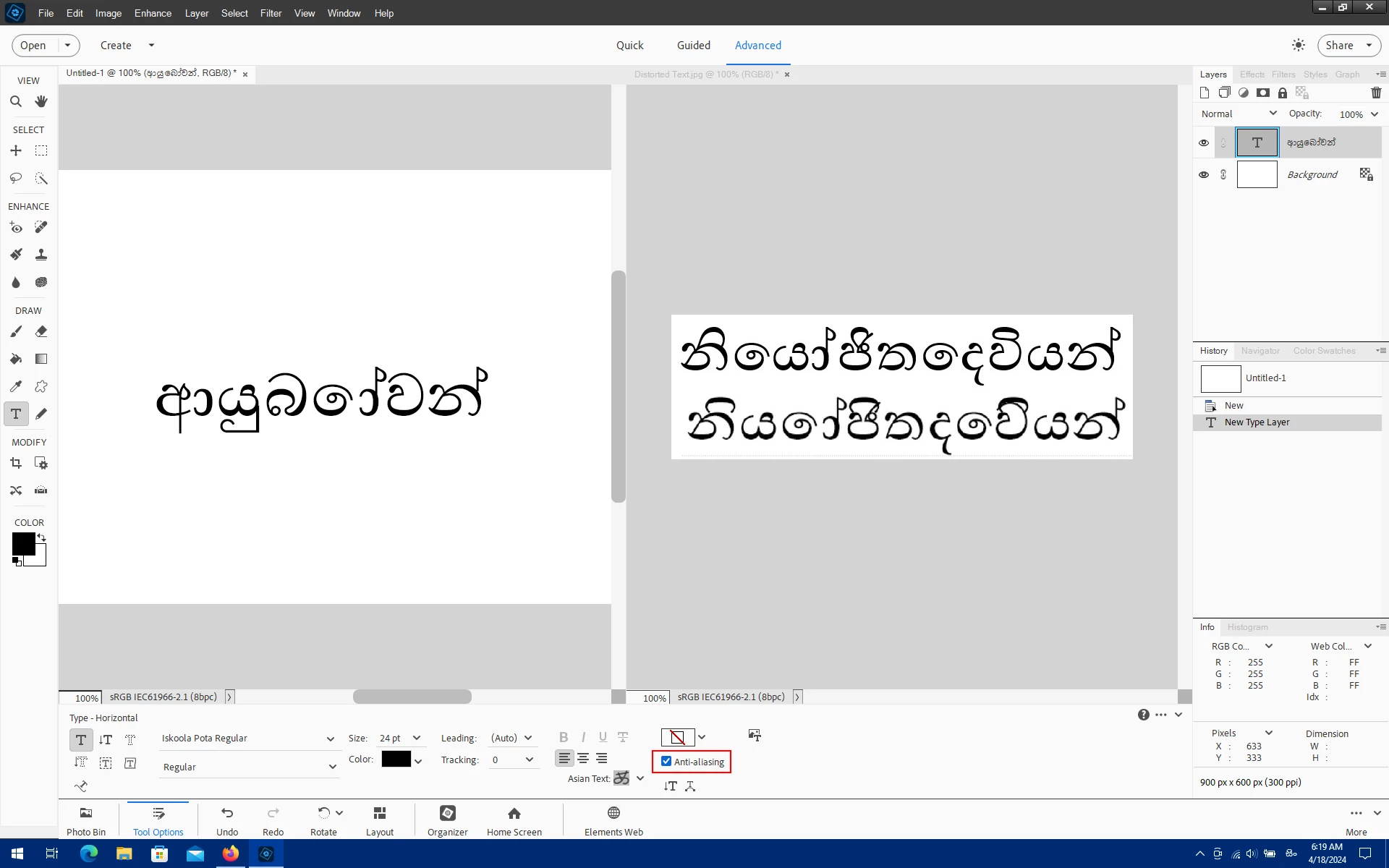 If I wish to type in Sinhala using Photoshop Elements I always get an incorrect display or distortion. (I also get the same problem in CorelDraw.) The fonts only display correctly in a word processor.