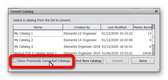 Next, you will close 2019 and launch Elements Organizer 2020. Go to File>Manage Catalogs and click the Convert button. See if your 2019 catalog is listed. If it was converted previously, it may not appear unless you click the show Previously Converted Catalogs box.