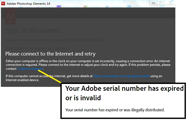 I have a licenced copy of Elements 14 (I verified this on my Adobe account). Now when I start it up, I get a screen telling me that my "Free Trial" has expired. There is no free trial! I bought and paid for this product.