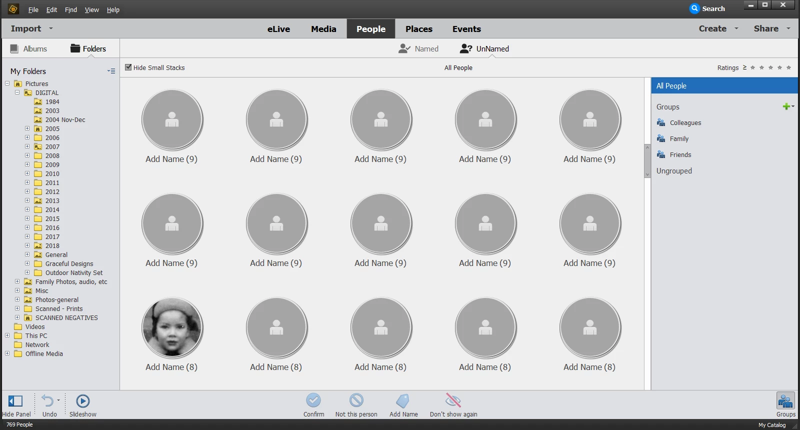 I am trying to assign names to the faces in the UnNamed People Stacks. Many stacks have no issues, but I have at least 200 stacks which display a generic person on a gray background. When I click on any of these icons, nothing happens.