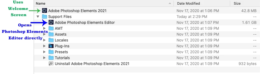 I'm hoping the answer is obvious and I'll apologize in advance for my "newbie" question. I have been using Elements 9 for a decade almost on my old iMac and just recently purchased a new iMac. Purchased Photoshop Elements 2021 after playing with trial version for a few days. Amazing the added features compared to old #9. Anyhow, I have two applications: Adobe Photoshop Elements 2021 and Adobe Photoshop Elements Editor on my dock but in my one of the Apps is in the support folder. When launched they appear to be the same? What am I missing. Thanks.
