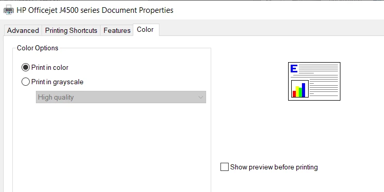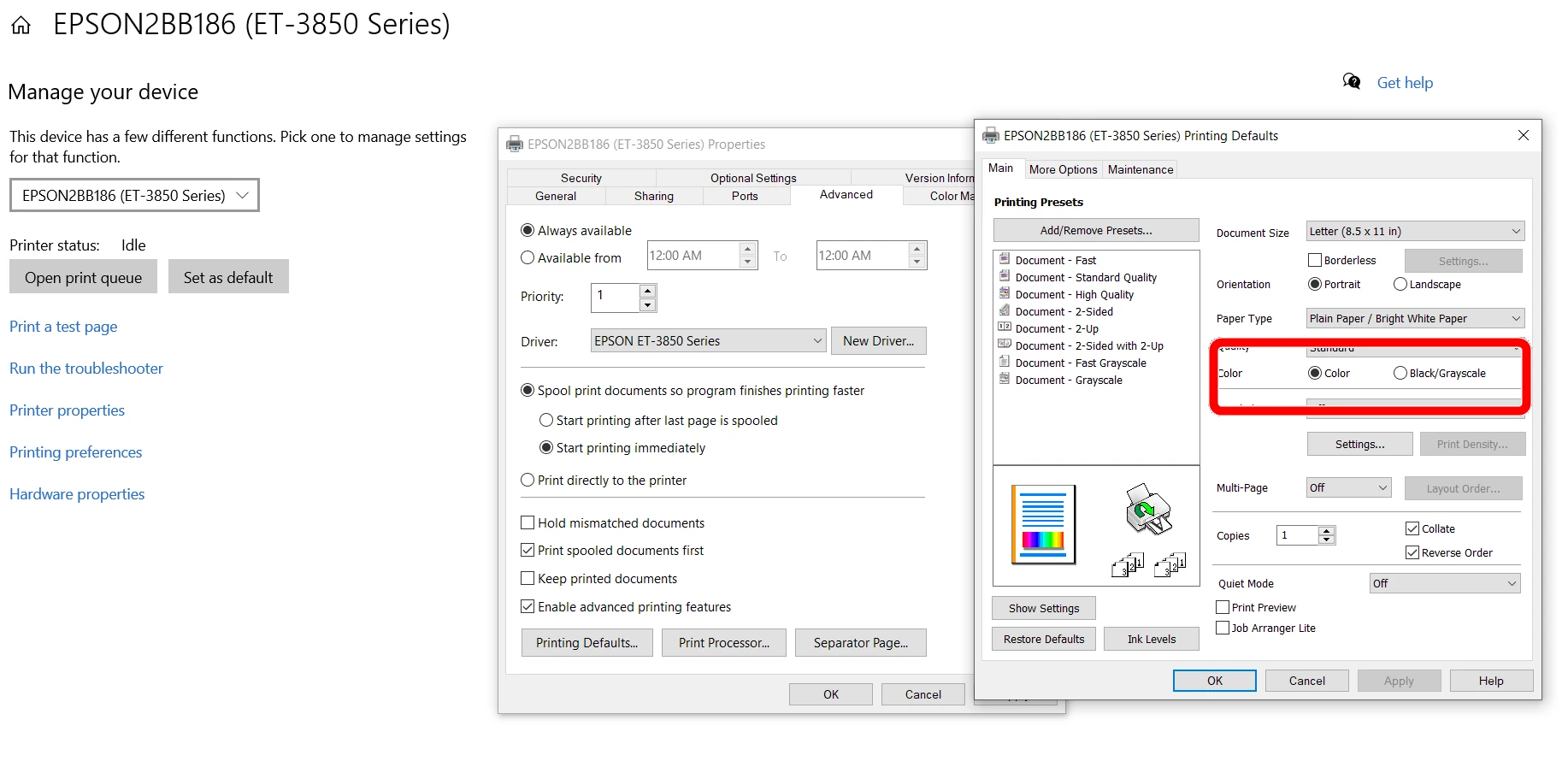 I have 2 win 10 machines. The one connected via wifi prints color & black/white ok.