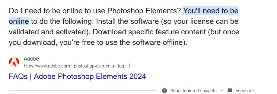 I just purchased and downloaded Elements 2024. The main reason I purchased it is because Adobe says it can be used OFFLINE once it's installed and not necessary to sign in (i.e. it's a stand alone product that can be used offline). I've entered the serial number and assumed it was activated at that point. (Apparently not tho' - my Adobe account shows I have no activated devices (using on my laptop only)).