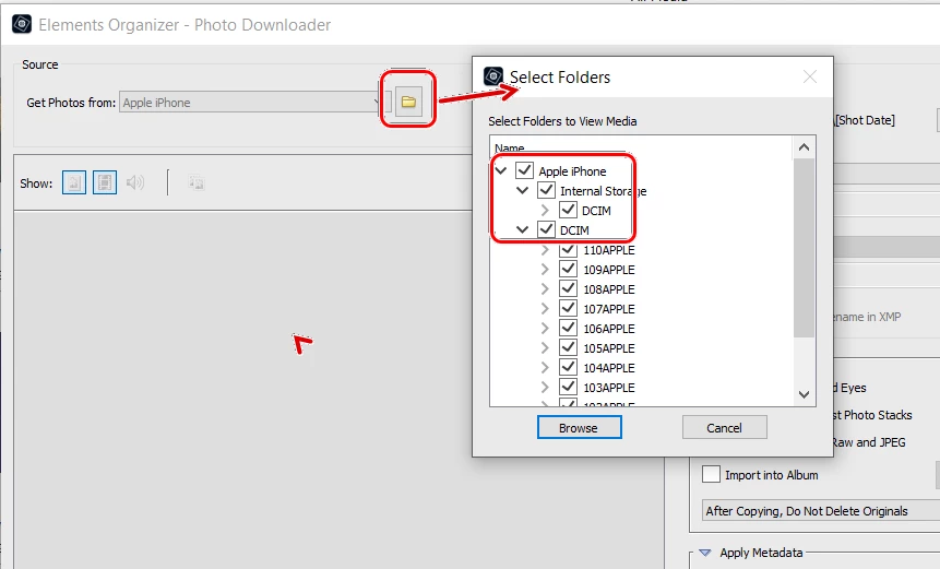 elements organizer shows two copies of each photo from my iPhone when downloading