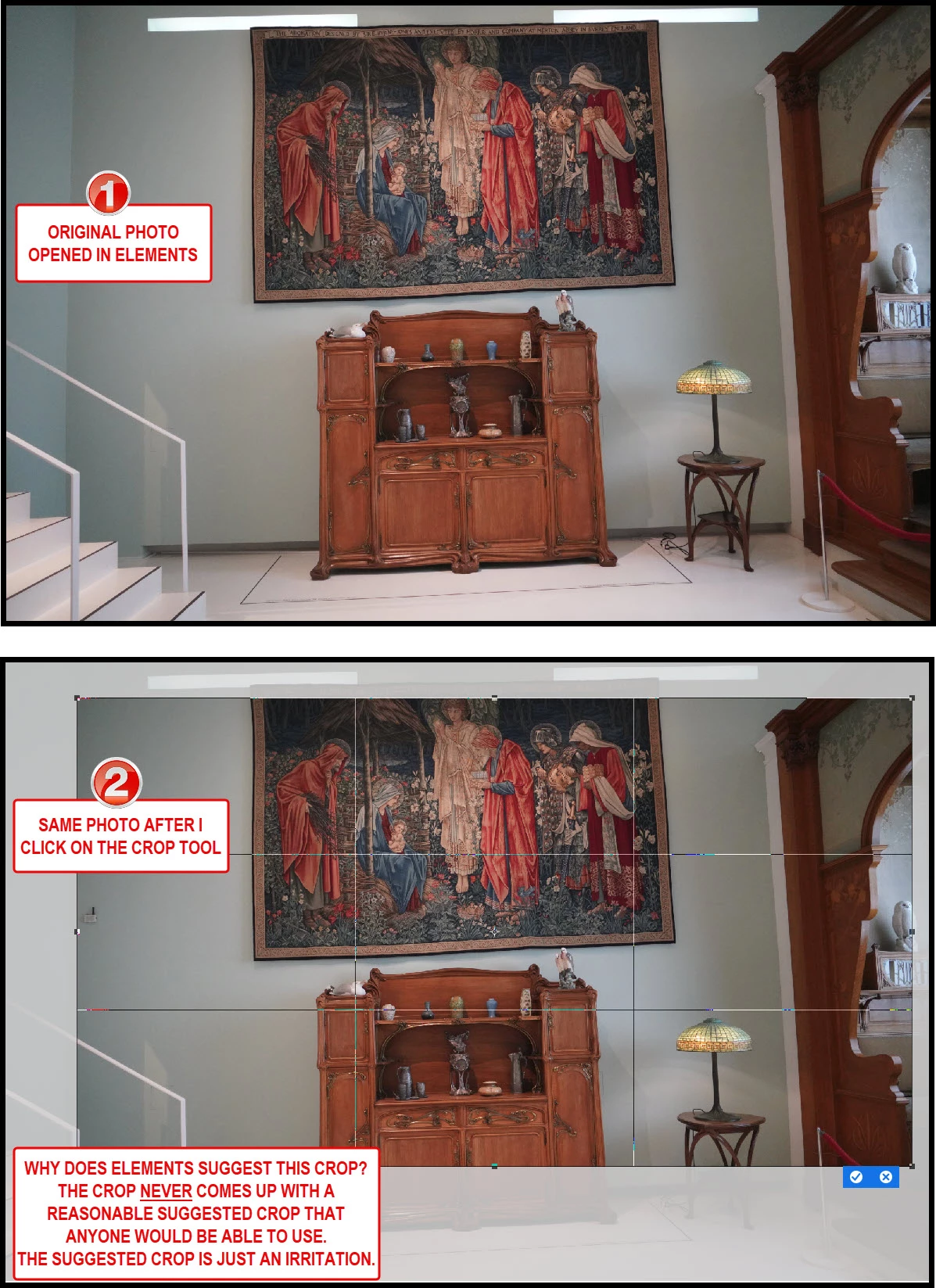Why does elements show a suggested crop when I click on the crop tool? It is never a crop anyone would ever use. It is always a bad crop. It is just an irritation. I alway have to adjust the crop to fit what I want. Why does Elements still have this feature?? Many people have commented that they hate this feature. Why can't I at least turn it off??