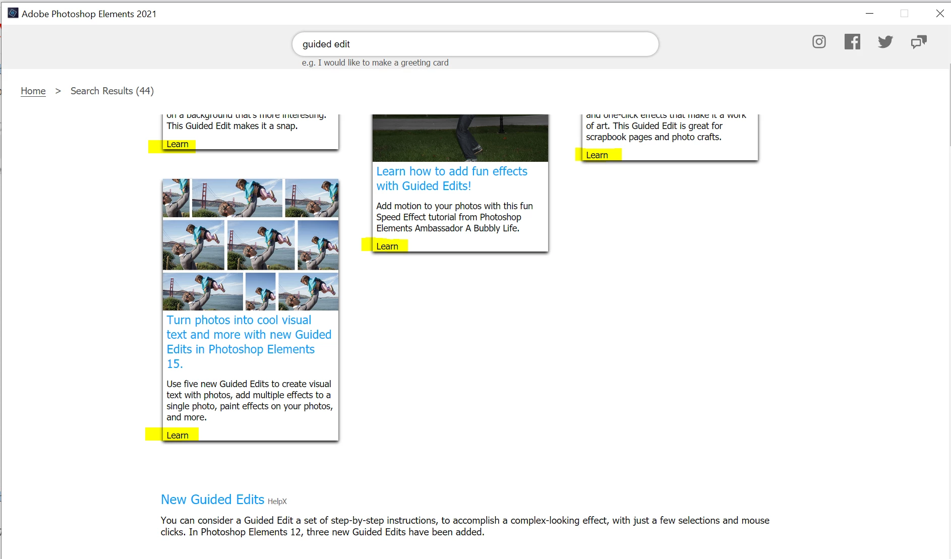 The Home Screen also has a search feature at the top. Depending upon what you search, results displayed contain related Helpx articles, and Learn cards from the original eLive section.