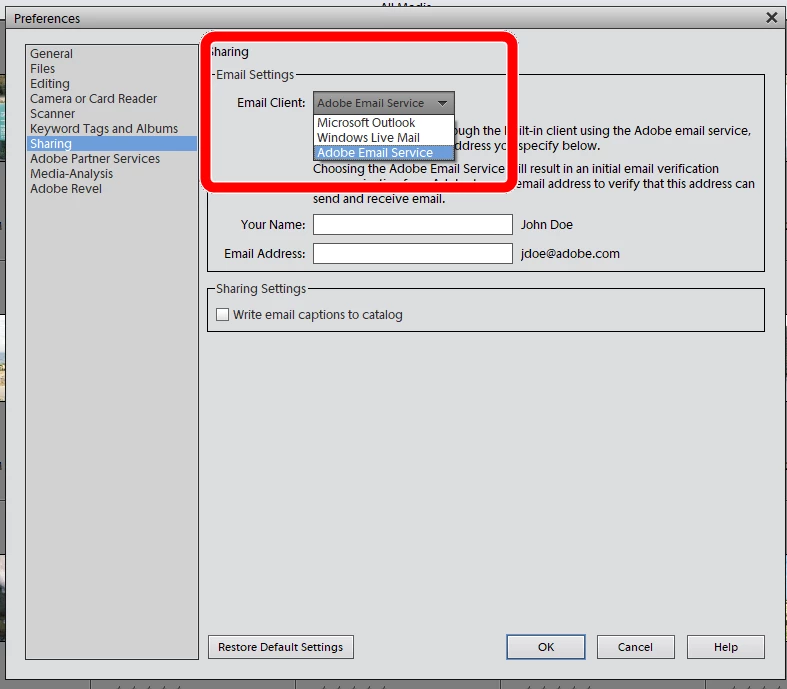 New Windows 10 PC and a fresh install of Elements. Tried to Share an image from Organizer. Email Attachment or Photo Mail, give the same message: Sharing via Email using Adobe Email Service is no longer supported. I am directed to Edit preferences, Sharing to select a different email client.The issue is that the only client option is the Adobe Email Service.